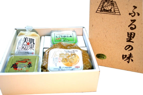 こうじみそ(1年天然熟成)・甘酒(麹の甘さ濃縮タイプ)・しょうゆのみ(天然醤油仕込み)・唐辛(自家栽培唐辛子)の4点セットになっております。