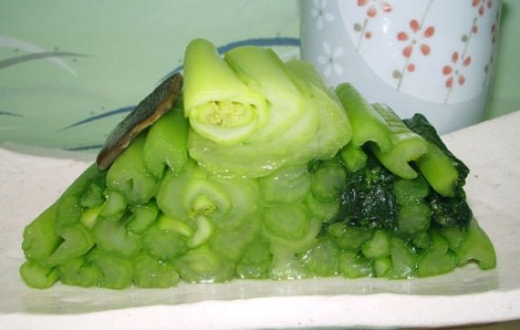 一般に、スーパー等の製品は合成調味液に入れて数日位で作ってしまいますが、この野沢菜漬は、氷冷蔵(‐3℃)の中 じっくり熟成させ、自然の風味を活かし、天日塩でうす塩味に漬け込んだ、野沢菜本来の旨味を活かした漬物です。