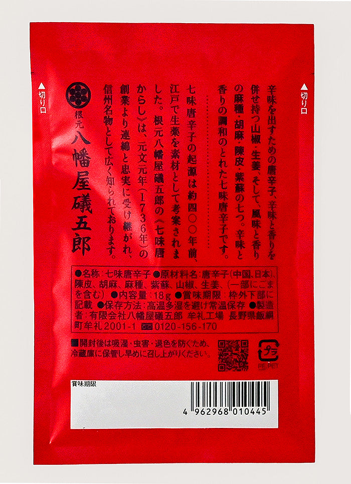 信州長野のお土産八幡屋礒五郎の七味唐辛子信州長野のお土産で人気の八幡屋礒五郎の七味唐辛子商品。 古来不変、独特の製法により調味した七味唐からし 「中辛」。 秘伝の調合で香りの中にも辛さが引き立ちます。 内容量18g賞味期限製造日より12ヶ月保存方法高温多湿を避けて常温で保存。開封後は冷蔵庫に保存し、お早めにお召し上がり下さい。原材料唐辛子、陳皮、胡麻、麻種、紫蘇、山椒、生姜、(一部にごまを含む)
