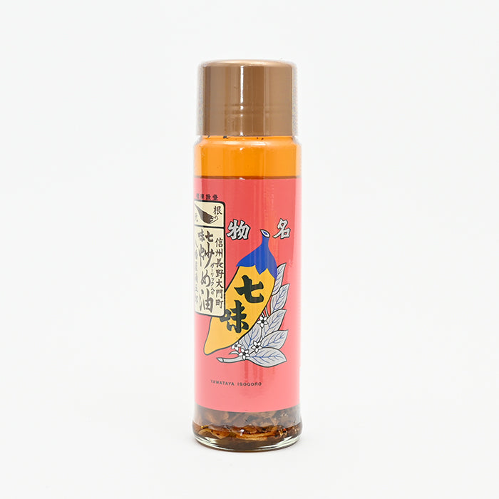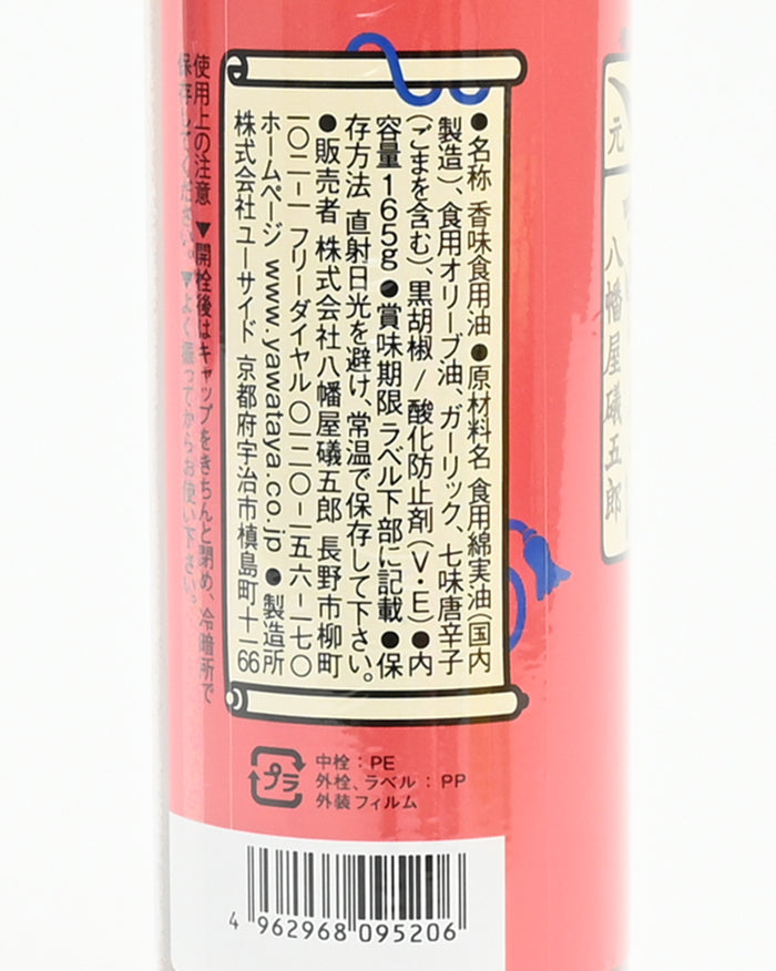 八幡屋礒五郎七味炒め油 信州長野のお土産で人気の八幡屋礒五郎の七味唐辛子商品。 八幡屋礒五郎七味炒め油 内容量 165ml 賞味期限 製造日より約9ヶ月 保存方法 直射日光を避けて保存して下さい。開栓後は密栓の上、高温を避けて保存し、なるべく早くお召し上がり下さい。 原材料 食用植物油脂(綿実油、オリーブ油)、ガーリック、七味(唐辛子、陳皮、胡麻、麻種、紫蘇、山椒、生姜)、黒胡椒、酸化防止剤(ビタミンE)