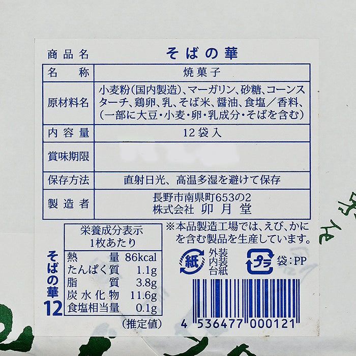 信州長野のお土産 そばの華12袋入 信州長野のお土産で人気の銘菓。 テレビでも取り上げられた人気のお土産品です。 内容量 2枚入×12袋入 賞味期限 製造日より2ヶ月 保存方法 直射日光、高温多湿を避けて保存 原材料 小麦粉、マーガリン、砂糖、コーンスターチ、鶏卵、乳、そば米、醤油(大豆・小麦を含む)、香料