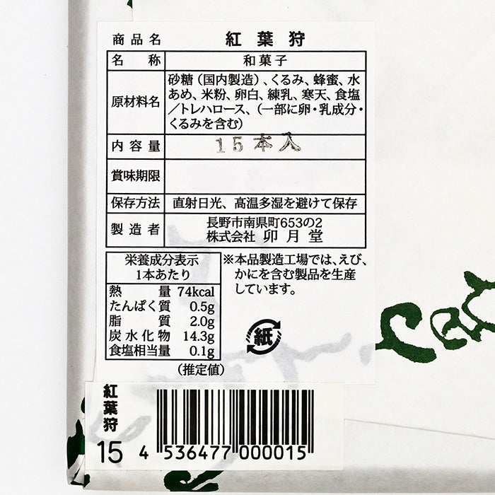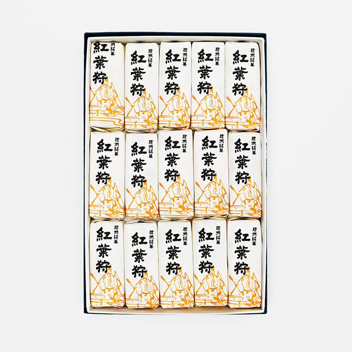 信州長野のお土産紅葉狩15本入信州、戸隠の鬼女紅葉伝説に因んで、菓名とした信州の代表的銘菓です。 はちみつとくるみを主原料に、口当たりよく上品な短冊型に創り風味を大切にした半生菓子。茶席用菓子として、ご進物として、広くご利用いただいております。内容量15枚入賞味期限製造日より2週間(6月~9月)、1か月(10月~5月)保存方法直射日光、高温多湿を避けて保存原材料砂糖、蜂蜜、寒天、くるみ、米粉、卵白、練乳、水飴