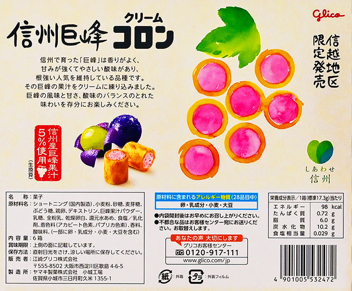 グリコ信州地区限定発売信州巨峰クリームコロン信州で育った「巨峰」は香りが良く、甘みが強くて優しい酸味があり、根強い人気を維持している品種です。その巨峰の果汁をクリームに練りこみました。巨峰の風味と甘さ、酸味のバランスの取れた味わいを存分にお楽しみください。内容量6箱賞味期限製造日より約10ヶ月保存方法直射日光、高音・多湿を避け、涼しい場所に保存して下さい。原材料ショートニング、小麦粉、砂糖、麦芽糖、ぶどう糖、鶏卵、デキストリン、巨峰果汁パウダー、乳糖、全粉乳、乾燥卵白、還元水飴、食塩/乳化剤、着色料(アカビート色素、パプリカ色素)、香料、酸味料、(一部に卵、乳成分、小麦、大豆を含む)製造工場ではそば、小麦、卵、乳を含む製品も生産しています。