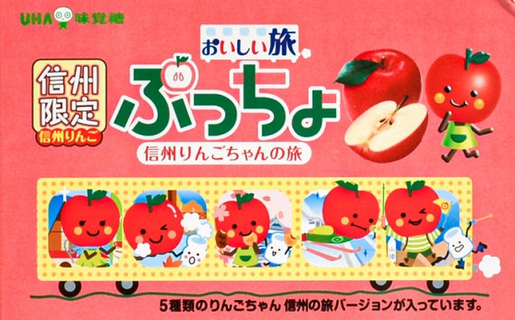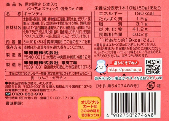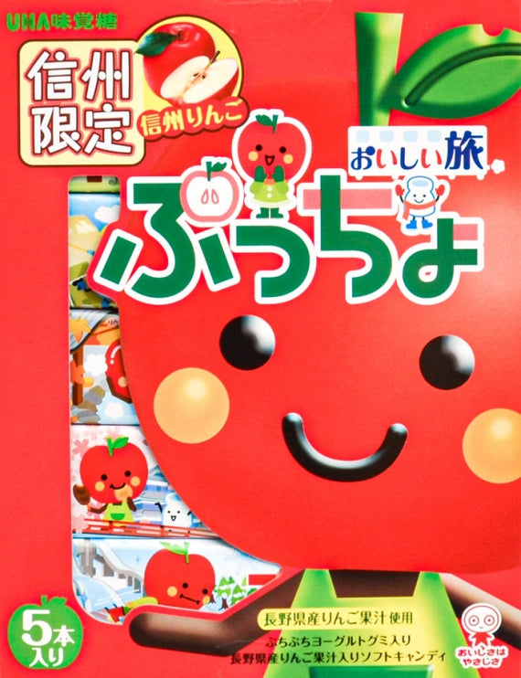 信州限定ぷっちょ(信州りんご)【信州長野限定のお土産】長野県産りんご果汁を使いました。ぷちぷち信州りんご果汁グミ入りのヨーグルトソフトキャンディです。内容量5本(10粒×5本)賞味期限製造日より約1年保存方法直射日光、高温多湿を避けてください。原材料水飴、砂糖、還元水飴、植物油脂、ゼラチン、乳酸菌飲料、果糖ブドウ糖液糖、乳加工品、濃縮リンゴ果汁、酸味料、乳化剤、香料、増粘多糖類、着色料、光沢剤