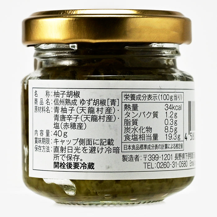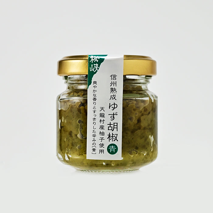 あらびきゆず胡椒青 信州長野のお土産天龍村産柚子使用、爽やかな香りとすっきりした辛味の青内容量 40g賞味期限 製造日より約1年半保存方法 直射日光を避け、冷暗所で保存ください。原材料 青唐辛子(天龍村産)。青柚子(天龍村産)、塩(赤穂産)