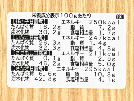 いなご、蚕のさなぎ、蜂の子、ざざむし、醤油、砂糖、水飴、みりん、粉寒天、(原材料の一部に小麦、大豆を含む)