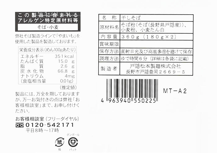 食塩不使用自家挽き戸隠産そば粉使用戸隠そば 信州長野のお土産名称/干しそば 乾麺内容量/360g(180g×2)賞味期限/製造日より約11ヶ月保存方法/直射日光、高温多湿を避けて保存してください。原材料/そば粉(長野県産そば)、小麦粉、小麦たん白(信州長野のお土産 おみやげ お取り寄せ ご当地 グルメ 信州そば 戸隠そば 干しそば)