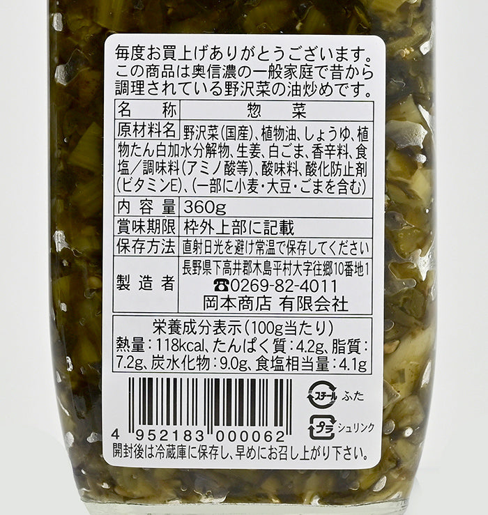 原材料/野沢菜(国産)、植物油、しょうゆ、植物たん白加水分解物、生姜、白ごま、香辛料、食塩/調味料(アミノ酸等)、酸味料、酸化防止剤(ビタミンE)、(一部に小麦・大豆・ごまを含む)