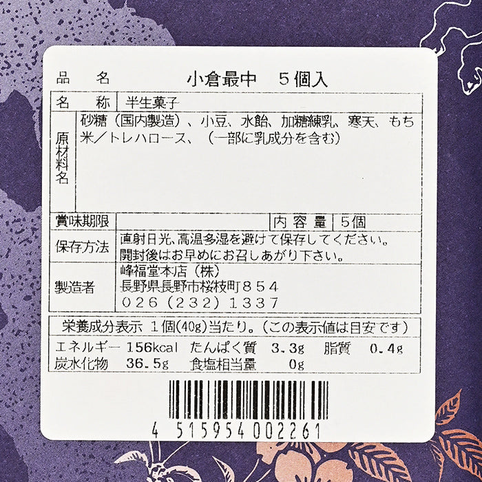 砂糖(国内製造)、小豆、水飴、加糖練乳、寒天、もち米/トレハロース、(一部に乳成分を含む)