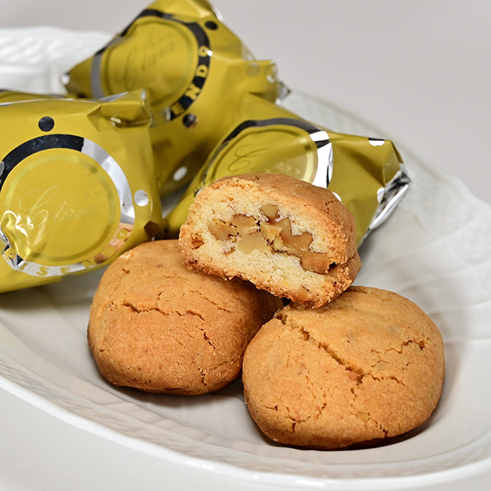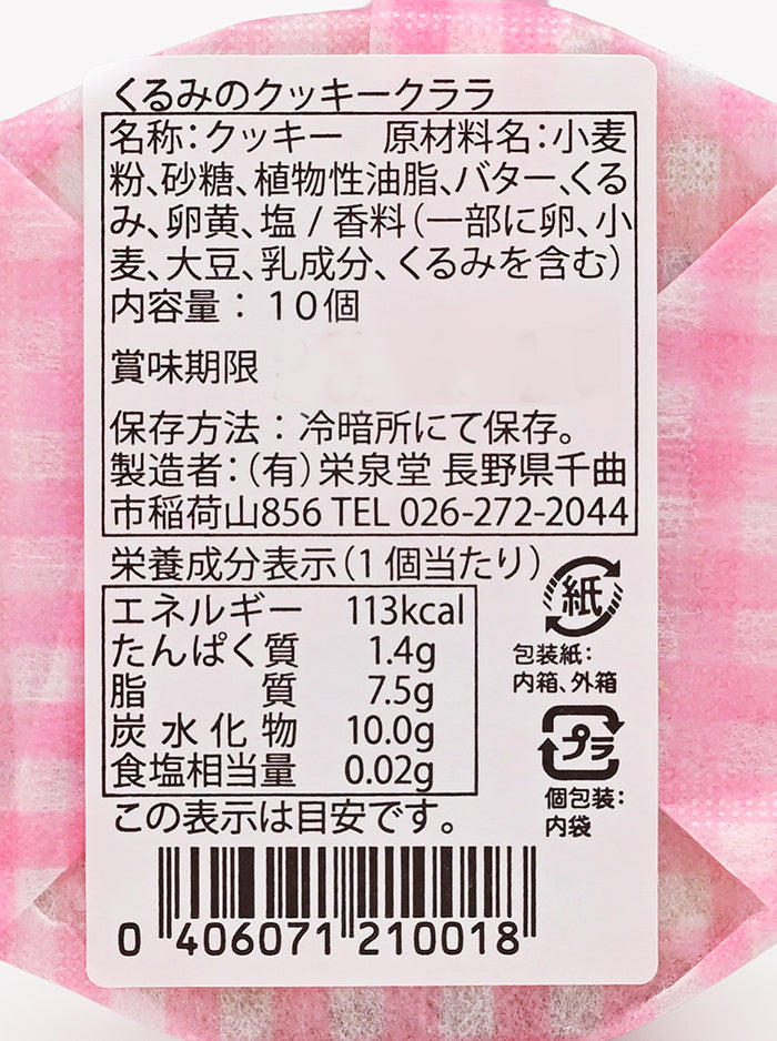 信州長野のお土産クララ円筒10個入大粒のくるみをまるごと使ったバターの香り豊かなソフトな手作りクッキー内容量10個入賞味期限製造日より1ヶ月半保存方法直射日光や多湿を避け、常温にて保管下さい原材料小麦粉、砂糖、バター、植物製油脂、くるみ、卵黄、アーモンド、塩、香料