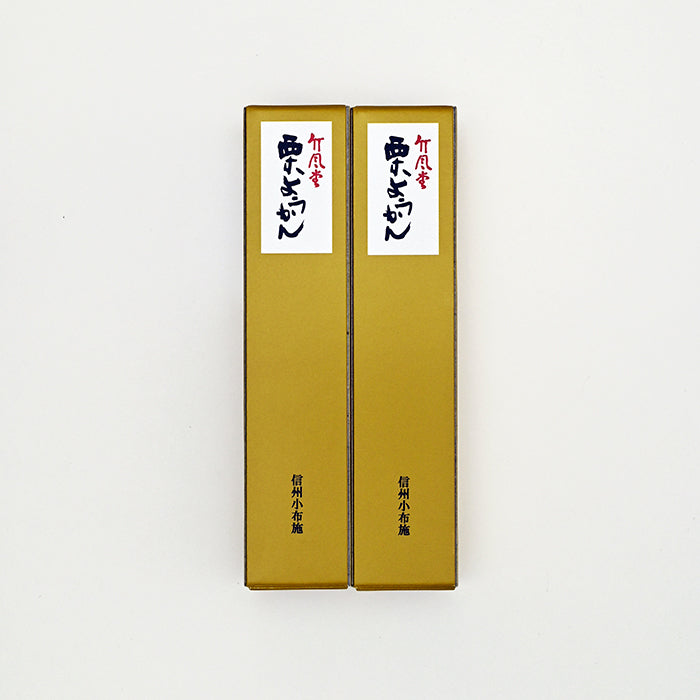 信州長野小布施のお土産竹風堂栗羊羹2本入り小布施栗菓子を代表するおいしさが味わえるうれしさ。どこでもすぐに召し上がれる手軽さが受けています。内容量1箱180g×2本入賞味期限製造日より1年保存方法直射日光、高温多湿を避けて常温で保存原材料砂糖、栗、寒天