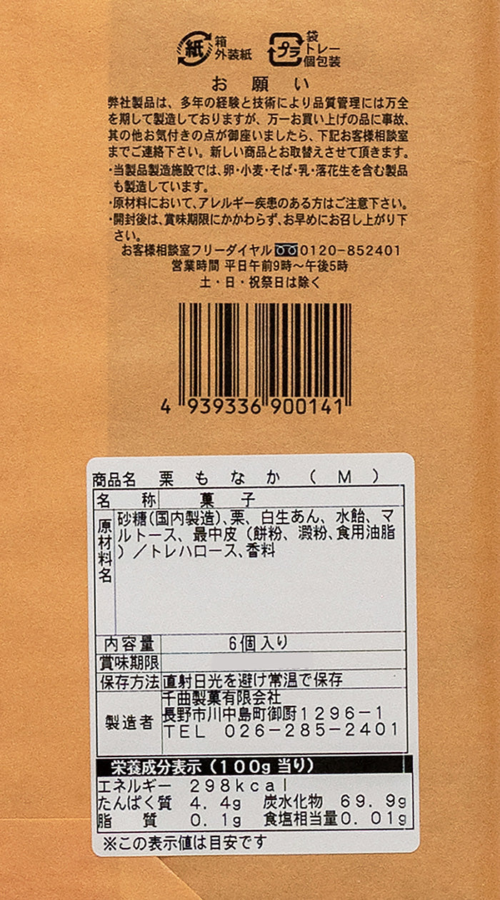 銘菓栗もなか【信州長野のお土産】栗あんの中に栗のつぶつぶが入った最中です内容量6個賞味期限製造日より約2ヶ月保存方法直射日光を避け常温で保存して下さい原材料栗、砂糖、水飴、マルトース、白生あん、最中種(餅粉、澱粉)、トレハロース製造工場では卵、小麦、そば、乳、落花生を含む製品も製造しております