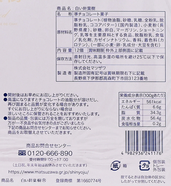 原材料/準チョコレート(植物油脂、砂糖、乳糖、全粉乳、脱脂粉乳、ココアバター)(国内製造)、小麦粉(長野県産)、砂糖、卵白、マーガリン、ショートニング、乳等を主要原料とする食品、脱脂粉乳、食塩/乳化剤、カゼインナトリウム、香料、着色料(カロテン)、(一部に小麦、卵、乳成分、大豆を含む)