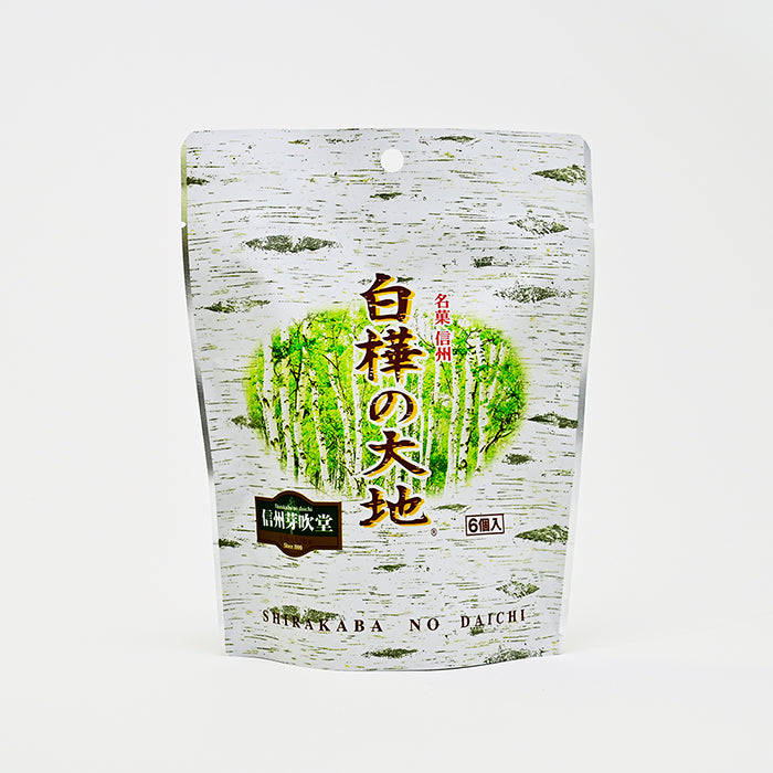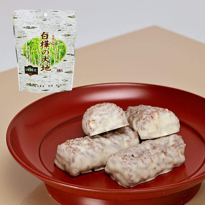 「白樺の大地」はミルクチョコレートにゴーフレットクラムをちりばめ、ホワイトチョコレートでコーティングしたチョコレート菓子。信州白樺の木をイメージして作ったお菓子です。