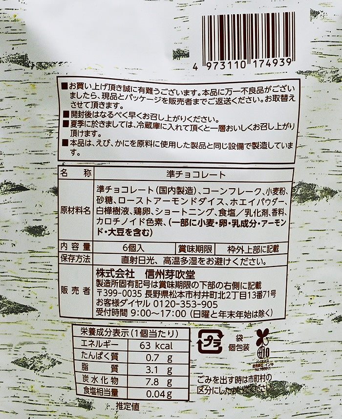 原材料/準チョコレート(国内製造)、コーンフレーク、小麦粉、砂糖、ローストアーモンドダイス、ホエイパウダー、白樺樹液、鶏卵、ショートニング、食塩/乳化剤、香料、カロチノイド色素、(一部に小麦、卵、乳成分、アーモンド、大豆を含む)