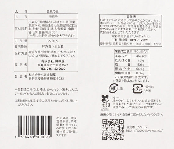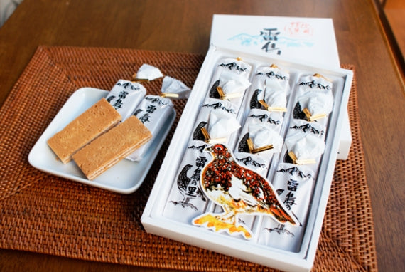 北アルプスを象徴する鳥"雷鳥"の名をいただいた欧風焼き菓子「雷鳥の里」。欧風せんべいにクリームをサンド。 サクッとした食感と軽やかなおいしさが人気のお菓子です。 お茶菓子として、コーヒー、緑茶なんでも合います。
