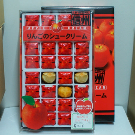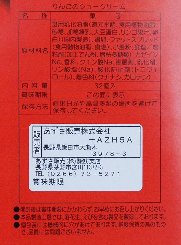 りんごのシュークリーム 32個入り【信州長野のお土産】内容量32個賞味期限製造日より約3ヶ月保存方法直射日光・高温多湿を避け、涼しい所で保存してください原材料食用乳化油脂(植物油脂、還元水飴、加糖練乳、砂糖、リンゴ果汁、卵白、その他)、鶏卵、ファットスプレッド(食用動物油脂、食塩)、小麦粉、食塩、増粘剤(加工澱粉、増粘多糖類)、香料、カゼインNa(乳由来)、乳化剤、クエン酸Na、膨張剤、着色料(カロチン)、リン酸塩(Na)酸化防止剤(トコフェロール)、(原材料の一部に大豆を含む)製造工場では落花生、えびを含む製品も製造しています。