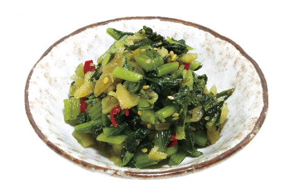 信州名物の野沢菜を食べやすい大きさに刻み、胡麻、唐辛子とあえました。あっさりとした旨味と鮮やかな彩が特徴な漬物です。