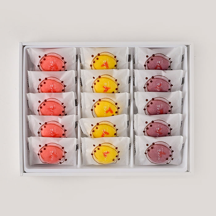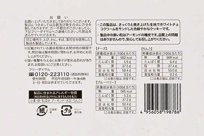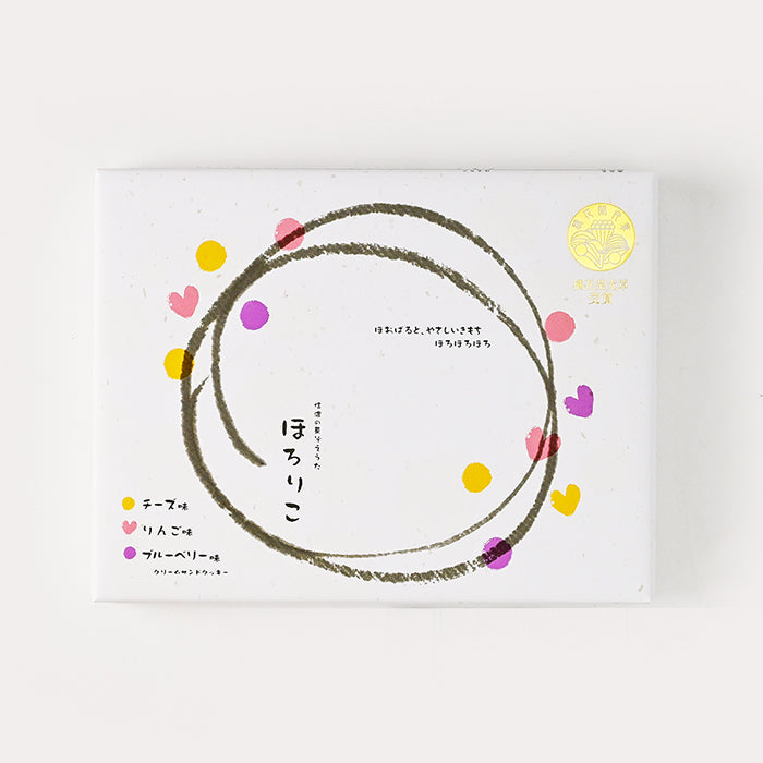 信濃の菓ぞえうた ほろりこ大 信州長野のお土産サクサクまぁるいクッキーにクリームをサンドしました。チーズ、りんご、ブルーベリーの3種類が楽しめる人気のマカロンみたいなクッキーです。内容量チーズ5個、りんご5個、ブルーベリー5個賞味期限製造日より約5ヶ月保存方法直射日光、高温多湿をお避け下さい。原材料【チーズ】小麦粉、ショートニング、チョコレートコーチング、砂糖、鶏卵、マーガリン、アーモンドパウダー、チーズパウダー、乳化剤、香料、着色料(赤色102号、カロチン)、(原材料の一部に大豆を含む)【林檎】小麦粉、ショートニング、チョコレートコーチング、砂糖、鶏卵、マーガリン、アーモンドパウダー、アップルパウダー、乳化剤、香料、着色料(赤色102号)、(原材料の一部に乳成分、大豆を含む)【ブルーベリー】小麦粉、ショートニング、チョコレートコーチング、砂糖、鶏卵、マーガリン、アーモンドパウダー、ブルーベリー果汁加工品、着色料(クチナシ、ラック、赤色102号)、乳化剤、酸味料、香料、増粘剤(キサンタンガム)、(原材料の一部に乳成分、大豆を含む)同一工場にてそば、落花生、えび、かにを含む製品も製造しています。