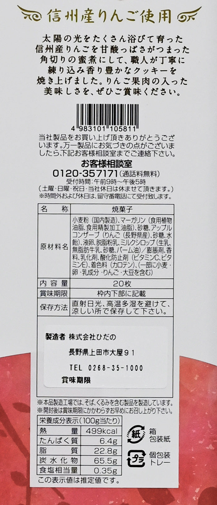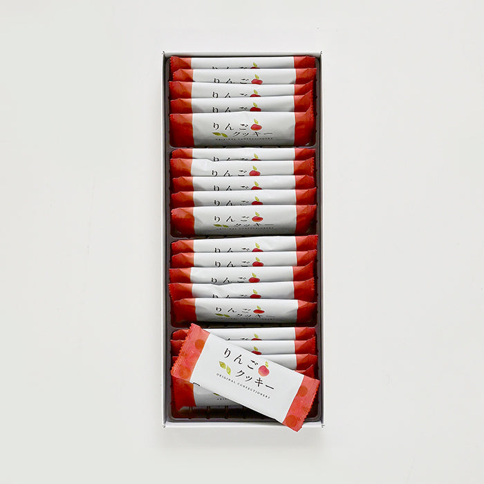 信州りんごクッキー20枚入 信州長野のお土産信州産林檎使用。太陽の光をたくさん浴びて育った信州産のりんごを甘酸っぱさが詰まった角切りの蜜煮にして職人が丁寧に練り込み香り豊かなクッキーを焼き上げました。りんごの果肉の入った美味しさをぜひご賞味ください。内容量20枚賞味期限製造日より約8ヶ月保存方法直射日光、高温多湿を避けて涼しいところで保存ください原材料小麦粉、砂糖、マーガリン、卵、りんご、脱脂粉乳、水飴、ミルクシロップ、膨張剤、香料、乳化剤、酸化防止剤(V.C、V.E)、着色料(カロチン)、(原材料の一部に大豆を含む)製造工場ではそばを含む製品も製造しています。
