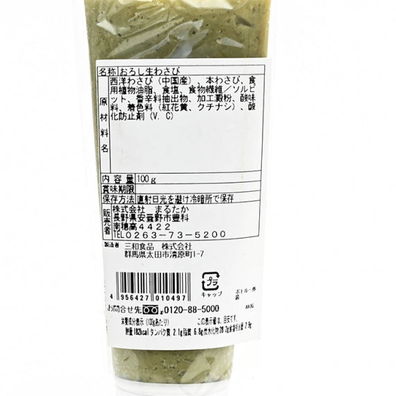本わさび、西洋わさび、食塩、食用植物油脂、植物繊維、ソルビット、香辛料、酸化防止剤(V.C)、酸味料、ミョウバン、着色料(紅花黄、クチナシ)