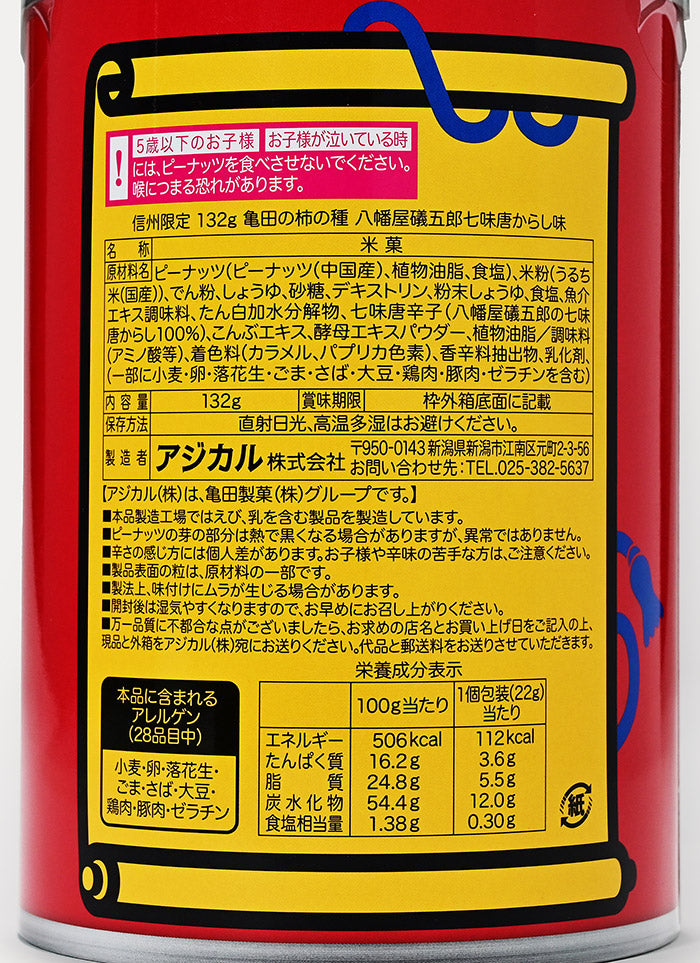 ピーナッツ(ピーナッツ(中国産)、植物油脂、食塩)、米粉(うるち米(国産))、でん粉、しょうゆ、砂糖、デキストリン、粉末しょうゆ、食塩、魚介エキス調味料、たん白加水分解物、七味唐辛子(八幡屋礒五郎の七味唐からし100%)、こんぶエキス、酵母エキスパウダー、植物油脂/調味料(アミノ酸等)、着色料(カラメル、パプリカ色素)、香辛料抽出物、乳化剤、(一部に小麦・卵・落花生・ごま・さば・大豆・鶏肉・豚肉・ゼラチンを含む)