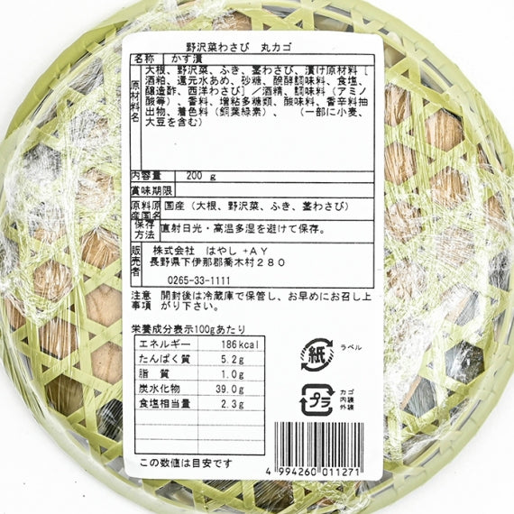 野沢菜わさび 丸カゴ野沢菜と酒粕の旨味ツーンとくるわさびが自慢の逸品です。内容量/200g賞味期限/製造日より約180日(信州長野のお土産 お菓子 特産品 お漬物 お取り寄せ ご当地 グルメ ギフト 土産 おみやげ 長野県 長野土産 長野お土産 お中元 お歳暮 通販)