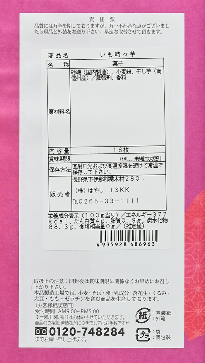 南信州いも時々芋16枚入 薄焼き煎餅南信州産のお芋を使用した香ばしいおせんべいです。内容量/16枚賞味期限/製造日より約180日製造工場では小麦、そば、卵、乳成分、落花生、くるみ、大豆、もも、ゼラチンを含む製品も生産しています。(信州長野のお土産 お菓子 和菓子 さつまいも お芋 煎餅 お取り寄せ ご当地 グルメ ギフト 土産 おみやげ 長野県 長野土産 長野お土産 通販)