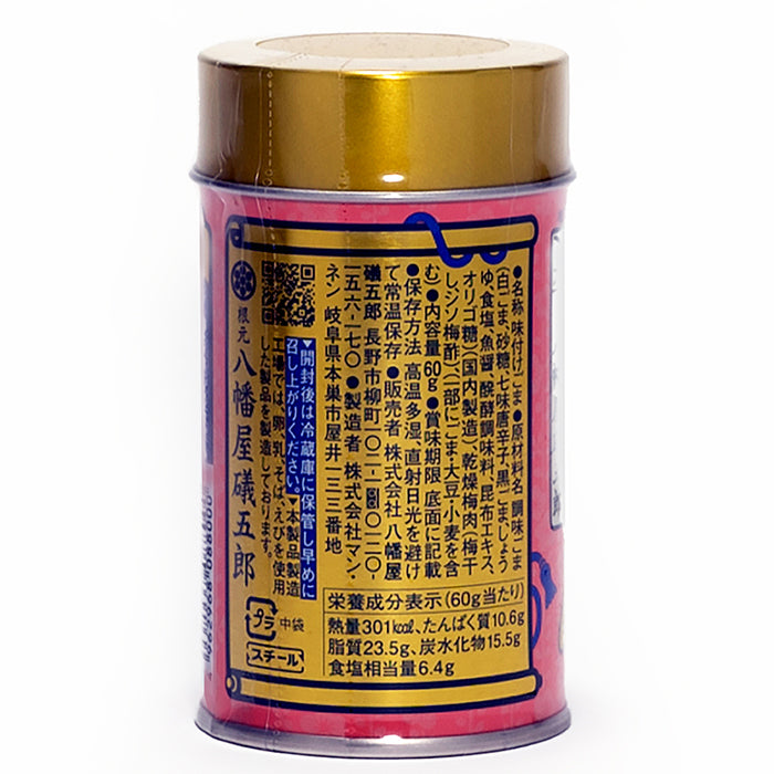 信州長野のお土産 八幡屋礒五郎 梅七味ごま缶 味付けごま信州長野のお土産で人気の八幡屋礒五郎の七味唐辛子商品。 胡麻に七味唐からし、乾燥梅肉を配合。 胡麻の香りと七味の辛さ、梅のほのかな酸っぱさをお楽しみください。内容量 60g賞味期限 製造日より約1年保存方法 高温多湿、直射日光を避けて常温で保存してください。開封後は吸湿・虫害・退色を防ぐため冷蔵庫に保存し、早めにお召し上がりください。原材料 調味ごま(白ごま、砂糖、七味唐辛子、黒ごま、しょうゆ、食塩、魚醤、醗酵調味料、昆布エキス、オリゴ糖)、乾燥梅肉(梅干し、シソ梅酢)(原材料の一部にごま、大豆、小麦を含む)製造工場で卵、乳、そば、えびを使用した製品も製造しています。(信州長野のお土産 八幡屋礒五郎 七味唐辛子 七味唐がらし 八幡や磯五郎 八幡屋磯五郎 土産 おみやげ 善光寺 長野県 長野土産 長野お土産)