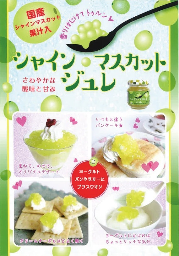 爽やかな酸味と甘み、香りはじけるシャインマスカットジュレ。ヨーグルトやパン、ゼリーにプラスオンでお楽しみください