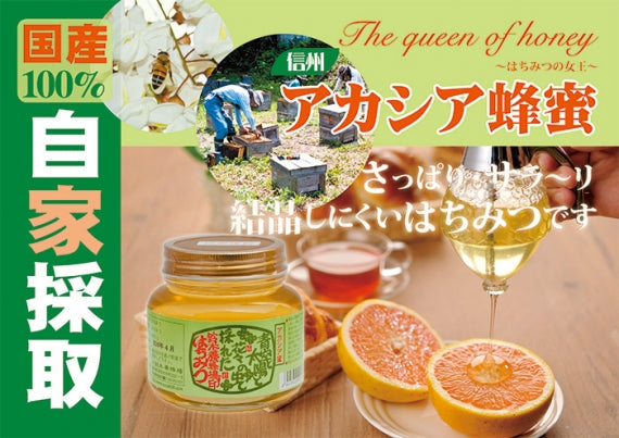 長野県須坂市の鈴木養蜂場の自家採取国産100%アカシア蜂蜜、ミツバチが集める花蜜が巣の中で十分な時間をかけて熟成させた天然完熟蜜であっさりした優しい甘さが人気に一品。冬でも結晶しにくいさっぱりサラーり蜂蜜の女王と言われる本物のアカシア蜜をご賞味ください