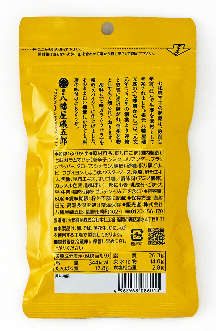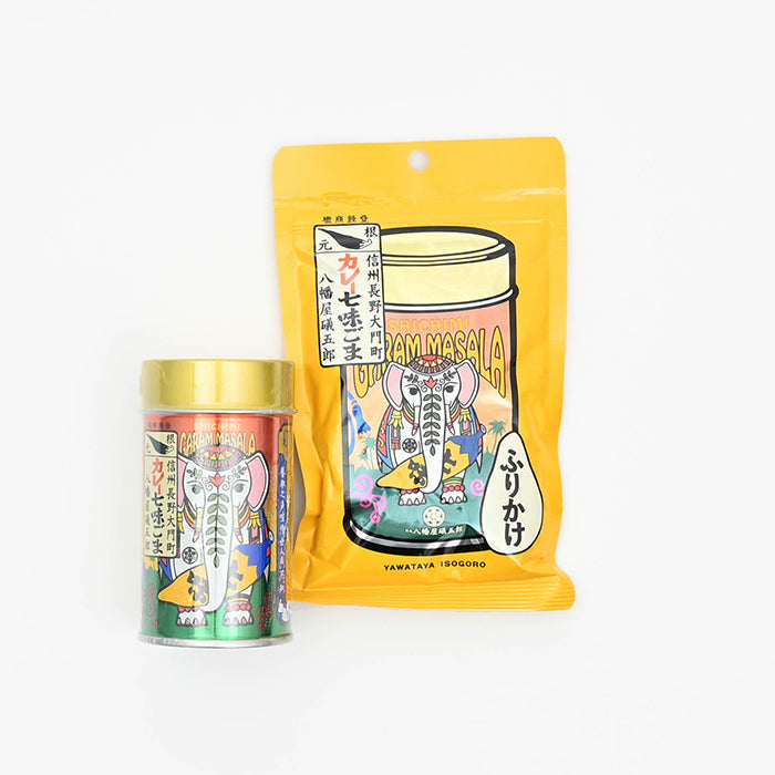 八幡屋礒五郎カレー七味ごま1缶+1袋 信州長野大門町 ふりかけ(信州長野県善光寺のお土産七味唐がらし)信州長野のお土産で人気の八幡屋礒五郎の七味唐辛子商品1缶+1袋詰め替えセット。信州長野大門町八幡屋礒五郎のカレー七味ごまは胡麻に七味ガラム・マサラを絡めてスパイシーに仕上げました。そのまま白いご飯にかけても、料理の味付けにもどうぞ八幡屋礒五郎カレー七味ごま1缶+1袋名称/ふりかけ内容量/60g缶+60g袋賞味期限/製造日より12ヶ月保存方法/直射日光、高温多湿を避けて常温で保存してください。開封後は冷蔵庫に保存し、早めにお召し上がりください。 原材料/ラベル添付本製品は卵、そば、落花生、かに、えびを使用する工場で製造しています。(信州長野のお土産 八幡屋礒五郎 七味唐辛子 七味唐がらし 唐からし 八幡や磯五郎 八幡屋磯五郎 土産 おみやげ カレー七味ごま カレー七味胡麻 七味ガラムマサラ 善光寺 信州大門 長野県 長野お土産)