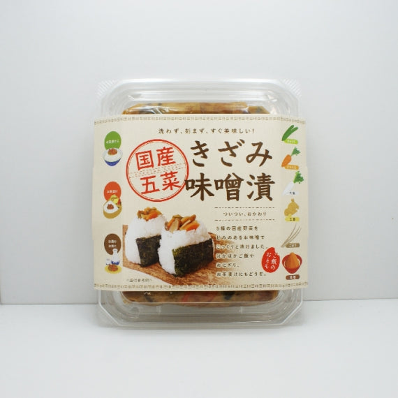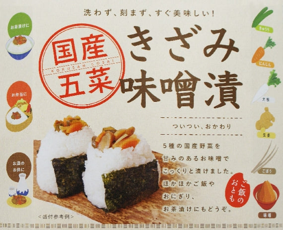 5種の国産野菜を甘味のあるお味噌でこっくりと漬けました。ほかほかご飯やおにぎり、お茶漬けにもどうぞ。