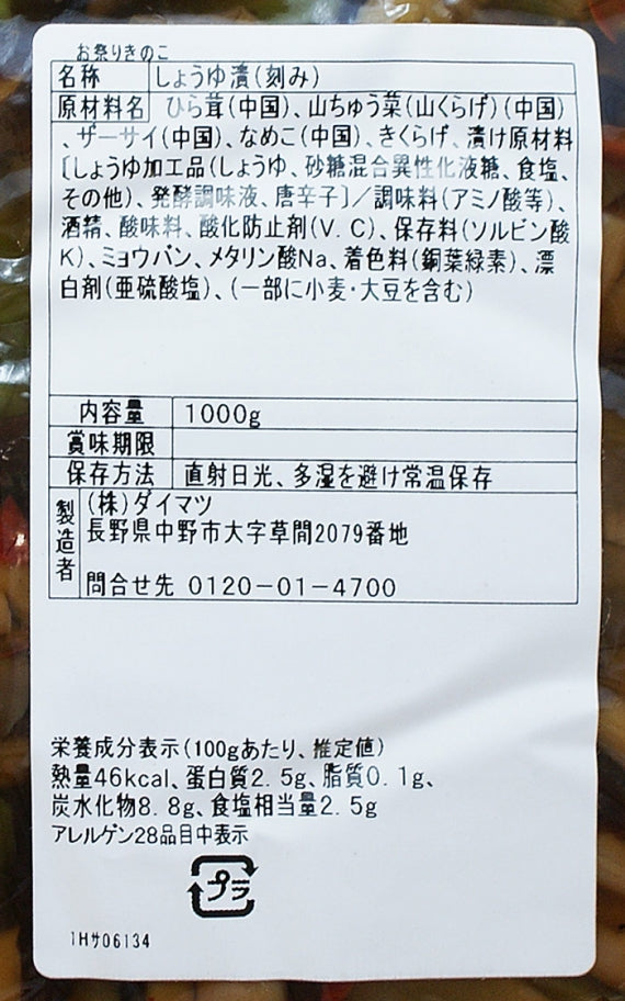 (業務用)お祭りきのこ 信州長野のお土産お惣菜おいしさいっぱい、きのこの千両役者の揃い踏み名称/しょうゆ漬(刻み)内容量/1,000g賞味期限/製造日より180日保存方法/直射日光、多湿を避け常温保存ください原材料/ラベル添付(信州長野県のお土産 お取り寄せ ご当地 グルメ ギフト おみやげ 信州のお漬物 お漬け物 醤油漬け しょうゆ漬け物 つけもの 長野土産 長野お土産 通販)