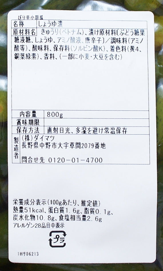 (業務用)ぴり辛小胡瓜 信州長野のお土産お惣菜ひとくちサイズで食べやすさが人気のピリ辛風味に仕上げました。食卓に、お酒の肴にお弁当などにもどうぞ名称/しょうゆ漬内容量/800g賞味期限/製造日より180日保存方法/直射日光、多湿を避け常温保存ください原材料/ラベル添付(信州長野県のお土産 お取り寄せ ご当地 グルメ ギフト おみやげ 信州のお漬物 お漬け物 胡瓜 きゅうり 醤油漬け しょうゆ漬け物 つけもの 長野土産 長野お土産 通販)