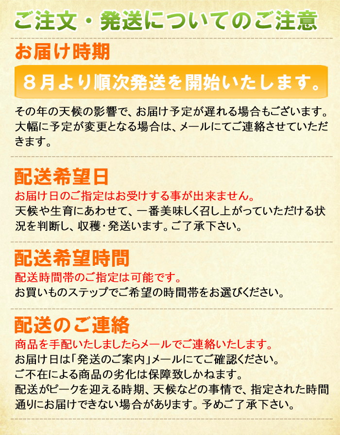 2回お届けの場合は、8月上旬、下旬の時期に発送いたします。