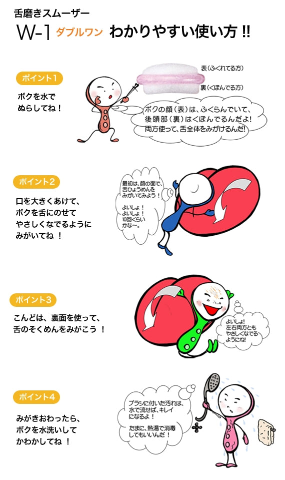 忙しい毎日の中で、口腔ケアを如何に短時間でできるのか、如何に気持ちよく使用して頂けるのかを解決した舌ブラシがW-1なのです。是非、お試し下さい。ご満足頂ける自信があります。