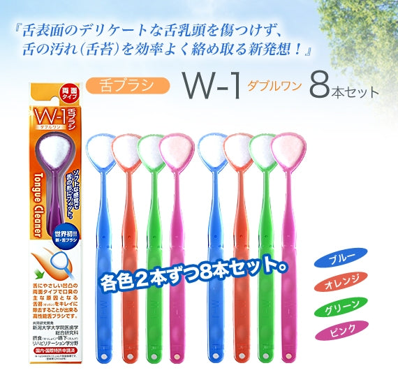 W-1はシキエン株式会社と新潟大学大学医歯学総合研究科との共同研究により製品化された舌専用の舌磨きスムーザーです。舌の微細構造に対して歯ブラシでは取り除きにくい食べカスや舌苔(ぜったい)を効果的に除去するために設計されています。
