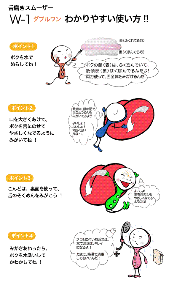 忙しい毎日の中で、口腔ケアを如何に短時間でできるのか、如何に気持ちよく使用して頂けるのかを解決した舌ブラシがW-1なのです。是非、お試し下さい。ご満足頂ける自信があります。