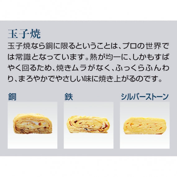 「玉子焼きは銅に限る!」熱伝導性に優れた銅製玉子焼き。ガスコンロの火を底面だけでなく側面まで素早く均一に伝えます。焼きムラのない、ふっくらふんわりとした玉子焼きに仕上がります。