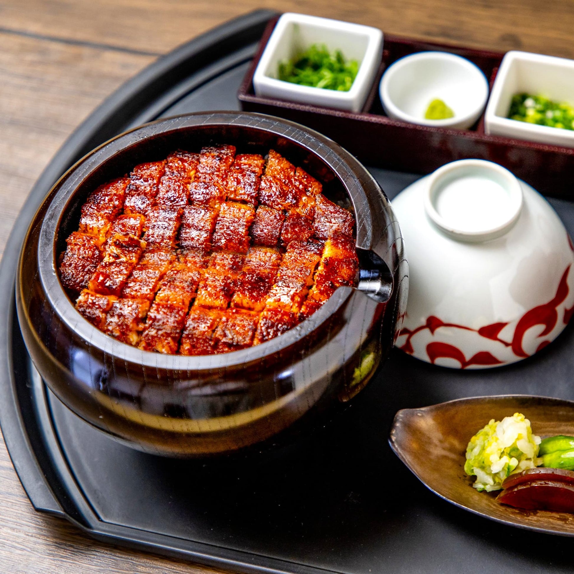 うなぎ蒲焼:国産うなぎ(養殖)、たまり、醤油、本みりん、砂糖、うなぎ骨お茶漬け用だし汁:醤油、鰹節、茶葉、鮪節、あじ節、椎茸、昆布エキス、たん白加水分解物、水飴、食塩、みりん、調味料薬味:わさび。刻み海苔、粉山椒