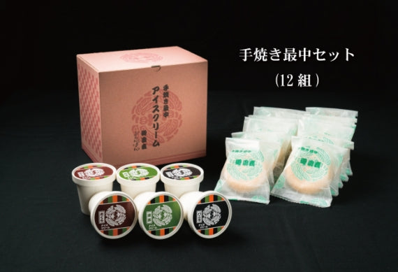 バニラアイス、抹茶アイス、小倉アイス(各4食分)、手焼き最中皮(12食分)