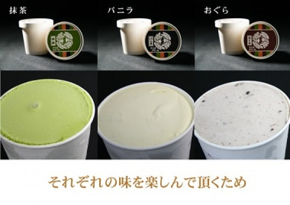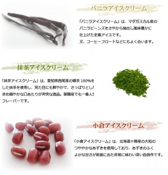 バニラアイスクリーム:牛乳、砂糖、クリーム、脱脂粉乳、卵黄、バニラビーンズ抹茶アイスクリーム:牛乳、砂糖、クリーム、脱脂粉乳、抹茶、洋酒小倉アイスクリーム:牛乳、砂糖、クリーム、脱脂粉乳、あん、水飴手焼き最中皮・もち米