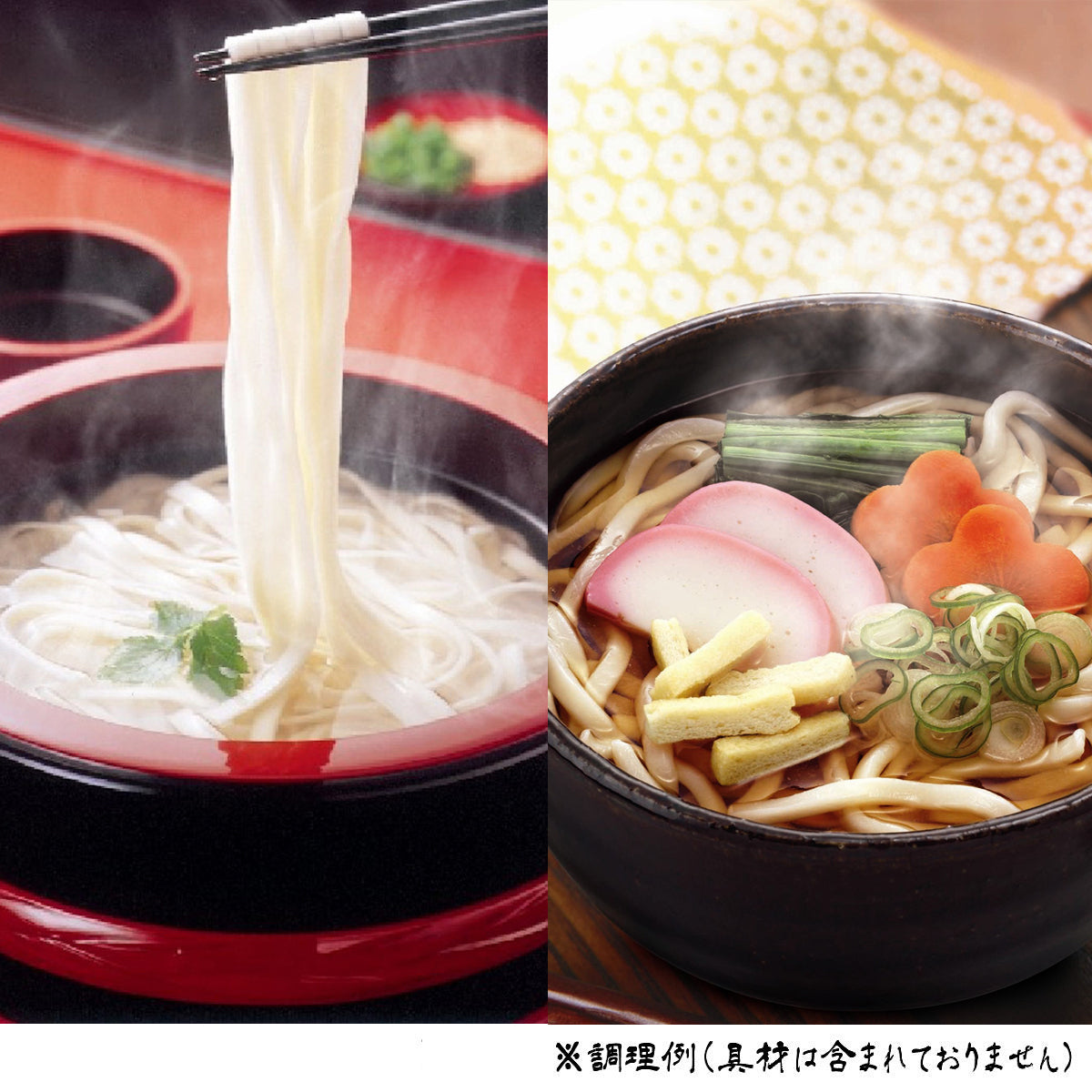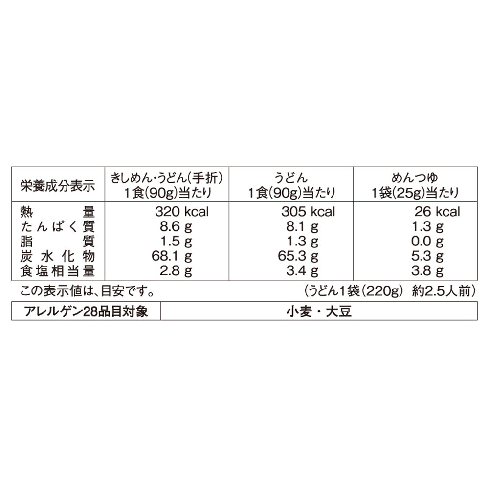 きしめん〔小麦粉(小麦(国産))、食塩、(一部に小麦を含む)〕うどん〔小麦粉(国内製造)、食塩、(一部に小麦を含む)〕うどん〔小麦粉(小麦(国産))、食塩、(一部に小麦を含む)〕めんつゆ〔しょうゆ、砂糖、食塩、かつおぶしエキス、昆布エキス/調味料(アミノ酸等)、カラメル色素、(一部に小麦・大豆を含む)〕