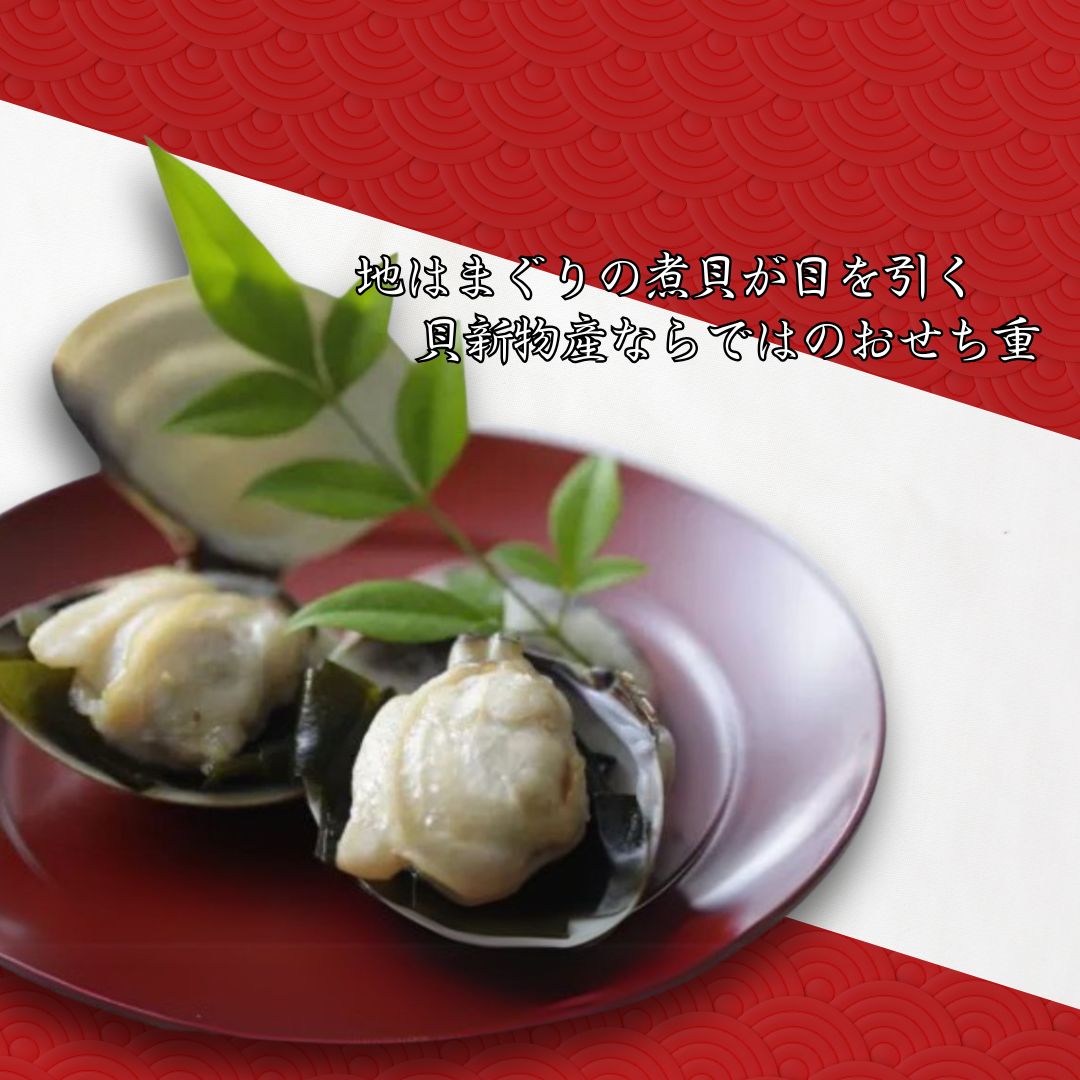 【一の重/12品目】 いくら醤油漬、甘海老糀漬、黒豆煮、田作り、くるみ飴炊き、はまぐり煮(わかめうま煮添え)、数の子松前漬、にしんマリネ、有頭海老煮、味付数の子、きんかん蜜煮、紅白かまぼこ 【二の重/18品目】 栗甘露煮、栗きんとん、かきいしる煮、真珠貝柱うま漬、帆立照焼、牛肉八幡巻、紅茶合鴨スモーク、キングサーモン西京焼、若桃シロップ漬、ぶり照焼、花麩、梅人参煮、牛肉しぐれ煮、穴子昆布巻、蟹味団子、筍煮、椎茸煮、焼湯葉巻