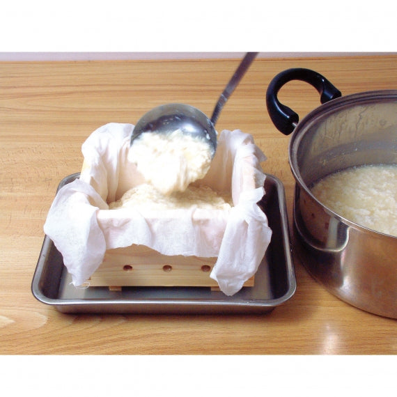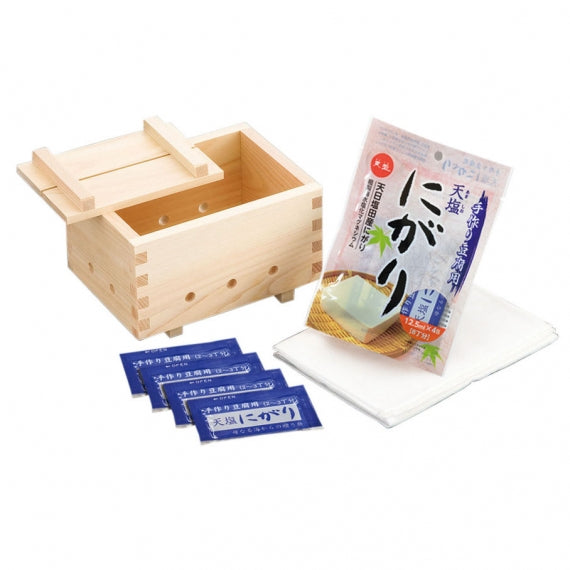 豆腐型(ひのき)、天然にがり(粗製海水塩化マグネシウム)、こし布・仕上げ布(綿)