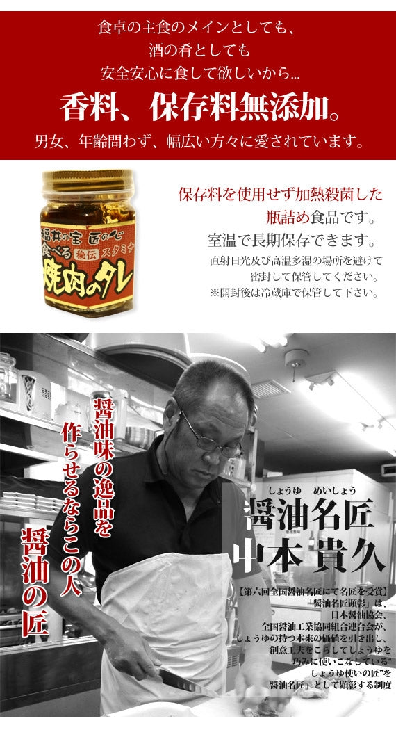 第6回 全国醤油名匠にて名匠を受賞した「店主 中本 貴久」が、醤油にこだわった焼肉のタレ