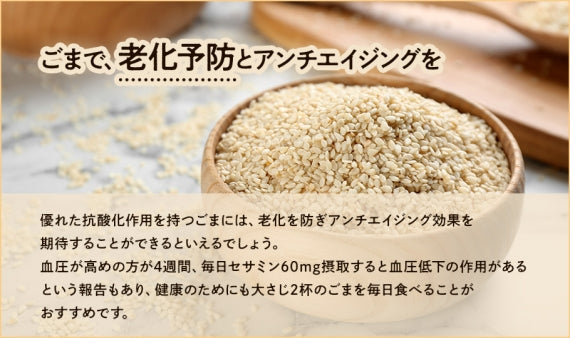 優れた抗酸化作用を持つごまには、老化を防ぎアンチエイジング効果を期待することができます。