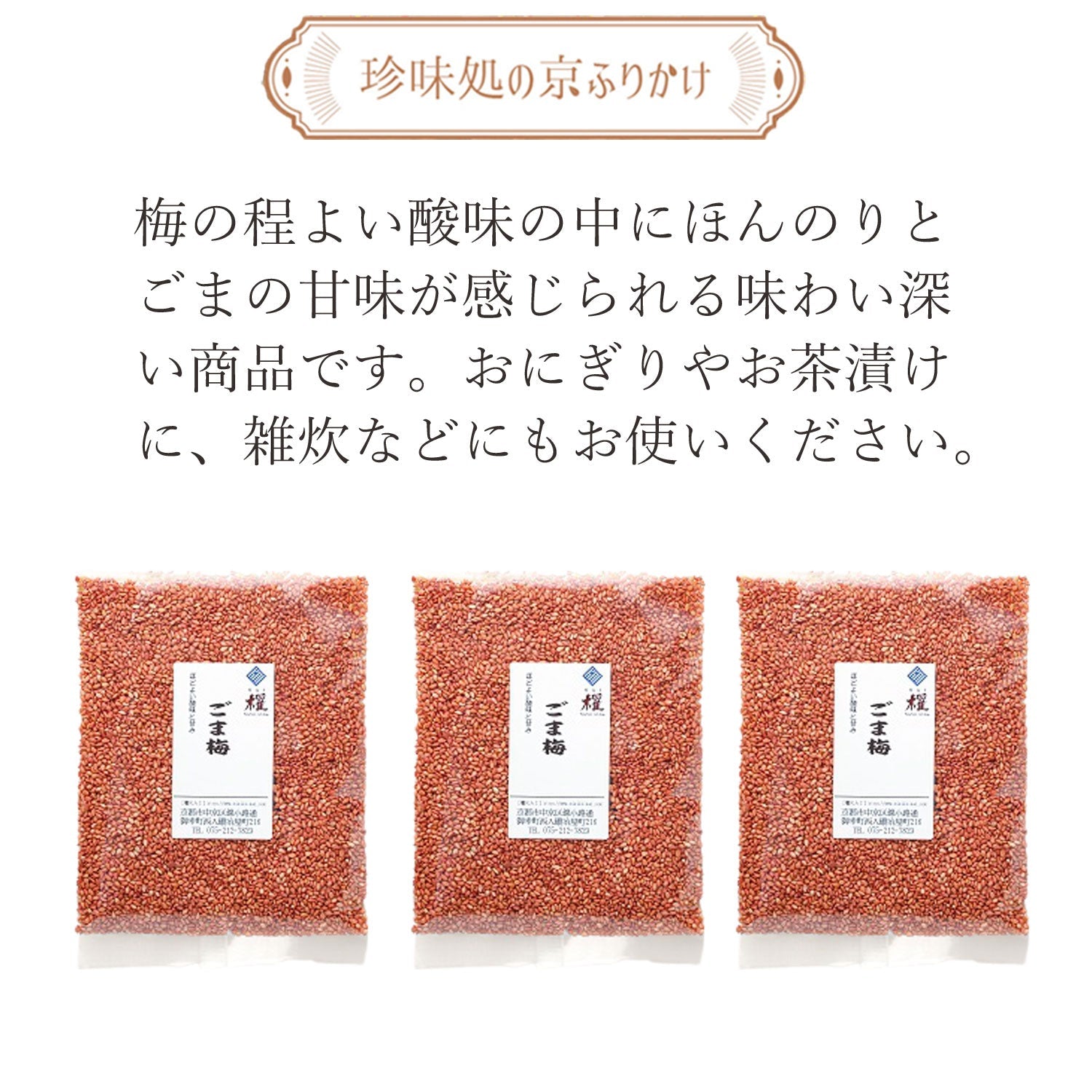 梅の程よい酸味の中にほんのりとごまの甘味が感じられる味わい深い商品です。おにぎりやお茶漬けに、雑炊などにもお使いください。