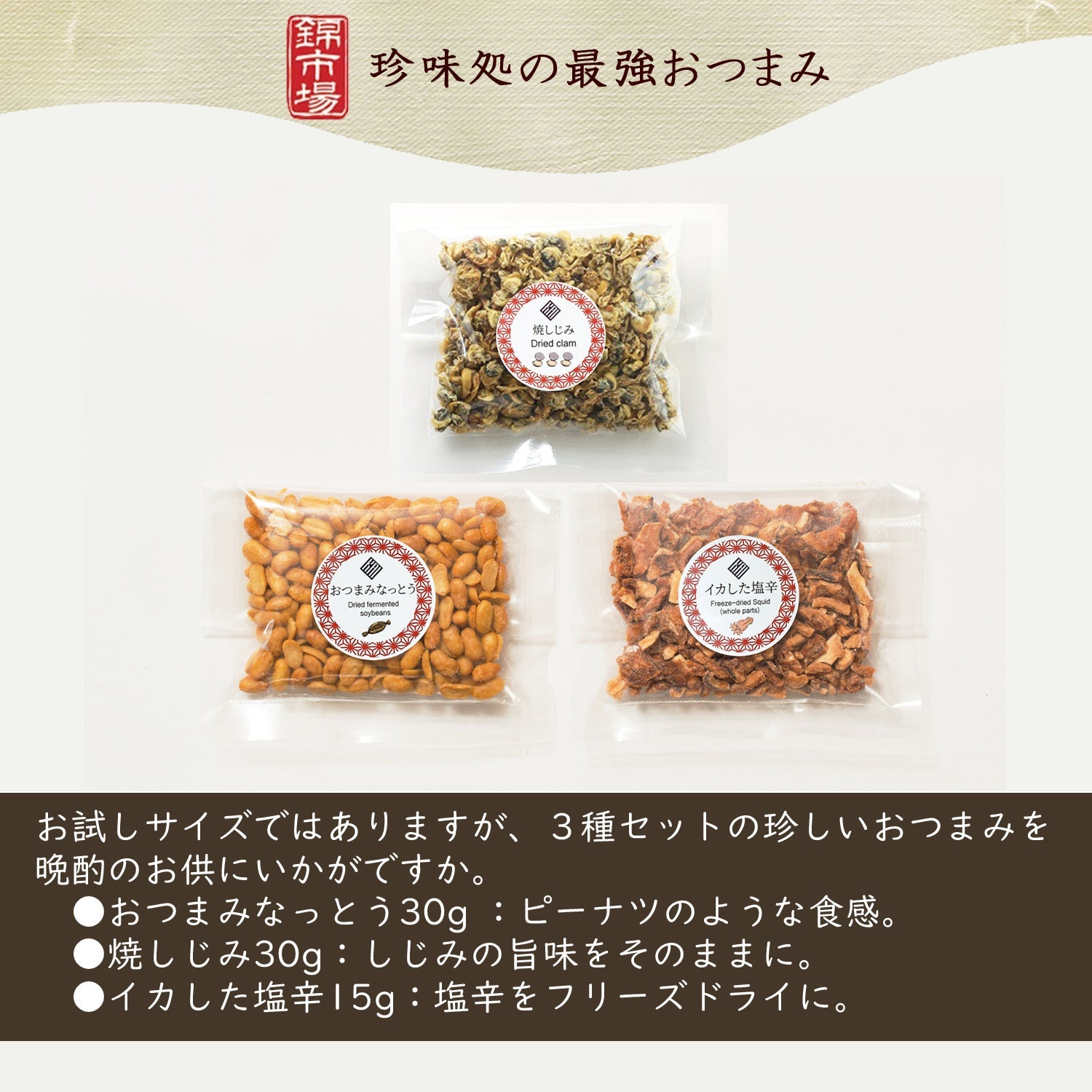 【おつまみなっとう】納豆(大豆:遺伝子組み換えでない)、植物油脂、塩、砂糖/調味料(アミノ酸等)【焼しじみ】しじみ(中国,インド),還元水あめ,醤油,生姜 / 調味料(アミノ酸等),甘味料(甘草、ステビア),酸化防止剤(ビタミンE)(一部に小麦、大豆を含む)【イカした塩辛】いか(国産)、デキストリン、食塩、いか肝臓、砂糖、醸造調味料、たん白加水分解物(小麦、大豆を含む)、かつお節粉末、酵母エキス、かつおエキス/ソルビット、調味料(アミノ酸等)、酒精、ph調整剤、増粘多糖類